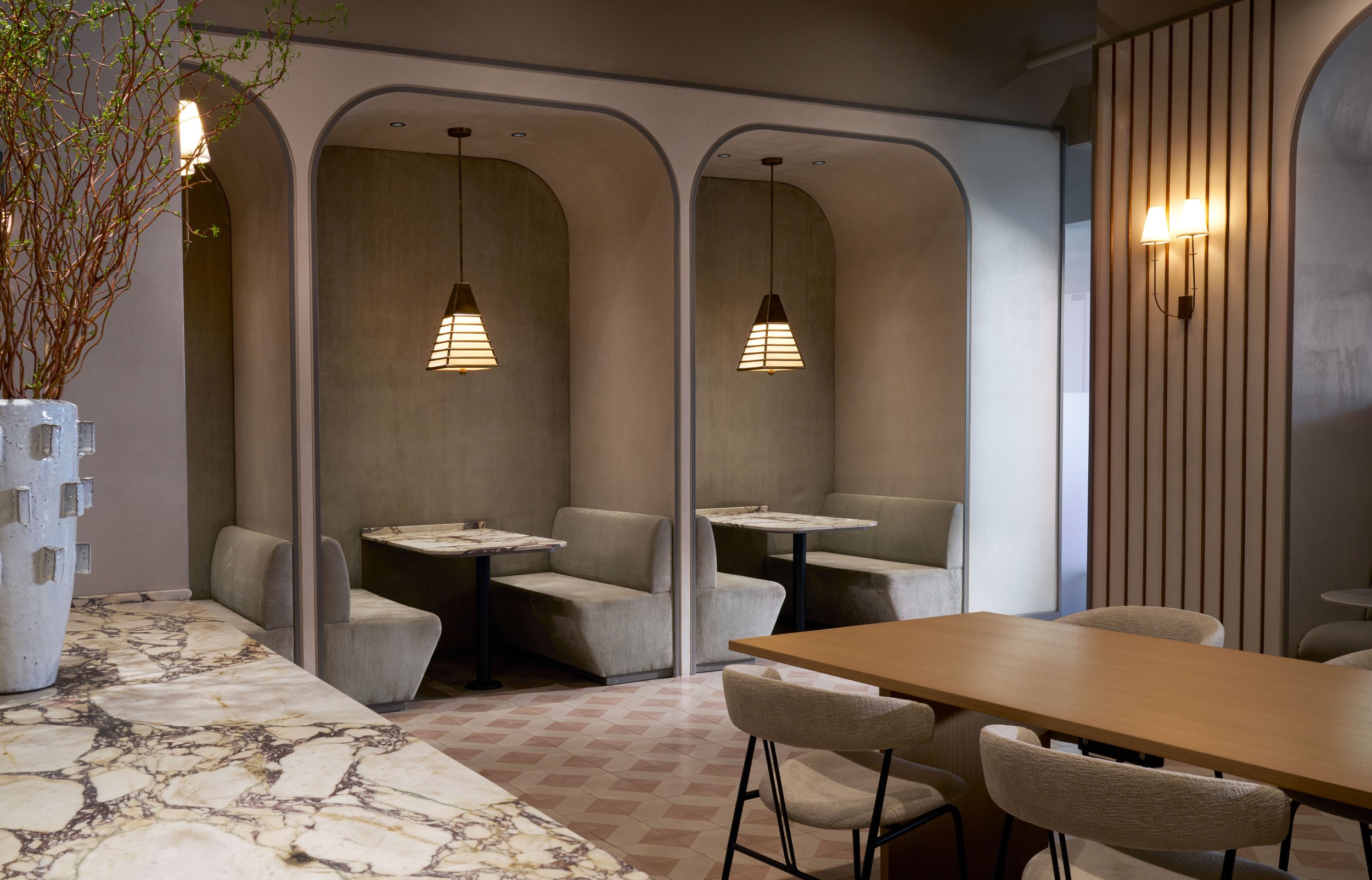 Inspired the interiors of Milanese trains, this multi-faceted workspace is full of our custom lighting, millwork and finishes.